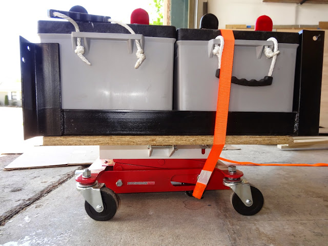 The battery bank has been installed and some of the cables made. The bank weighs about 300lbs and is mounted aft of the rear axle where the spare tire normally goes. Getting the batteries mounted was quite the ordeal. I gave up on using pure muscle, and bought a transmission jack. After that it went quite smoothly! Never under estimate the value of correct tools. Now I have to find a reason to use this tool again (can you see how I make more work for myself?).